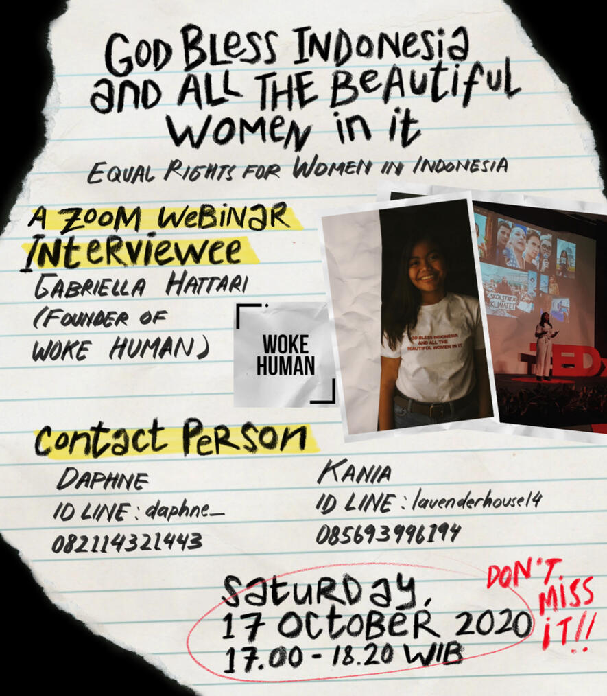 Hai, semua Kami adalah siswi kelas XIIMIPA4 angkatan 2021 SMA Santa Ursula Jakarta. Pada bulan November 2020, kami diberikan tugas PPKn untuk membuat sebuah webinar yang bertemakan tentang peradilan di Indonesia. Maka dari itu, kami membuat webinar berjudul "God Bless Indonesia and All The Beautiful Women In It" dengan narasumber Gabriella Hattari yang merupakan pendiri WokeHuman, sebuah organisasi aktivis yang mendukung kesetaraan di Indonesia. Webinar ini membicarakan tentang banyak hal, terutama berkaitan dengan “Equal Rights for Women in Indonesia,” termasuk RUU PKS dan apa yang bisa dilakukan oleh anak-anak muda untuk memperjuangkan keadilan di Indonesia.